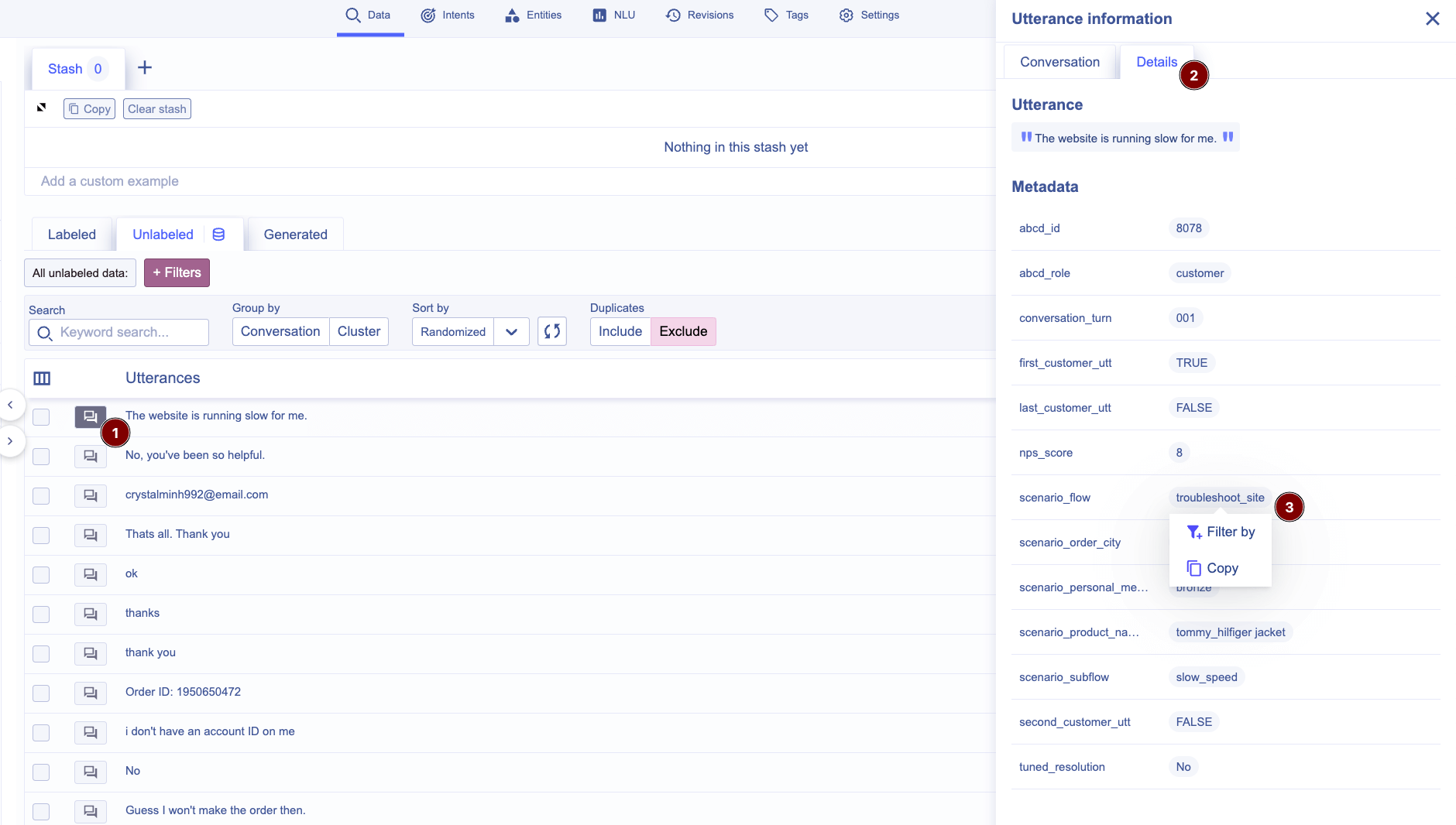 Metadata is a user-defined set of information that can be added to uploaded utterances by using the JSON format. This will enable you to filter your data based on its metadata values.
