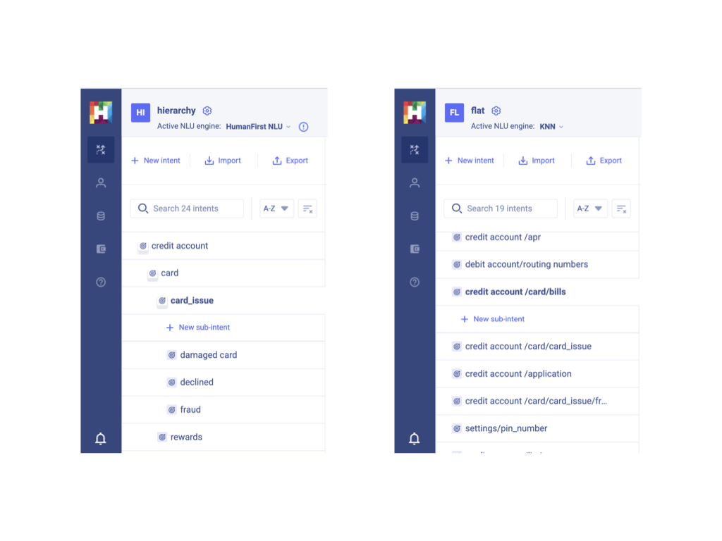 Flat lists of intents can become very cumbersome and difficult to visualize. Having your intents organized hierarchically allows your models to scale by keeping topics organized and easily visualized.